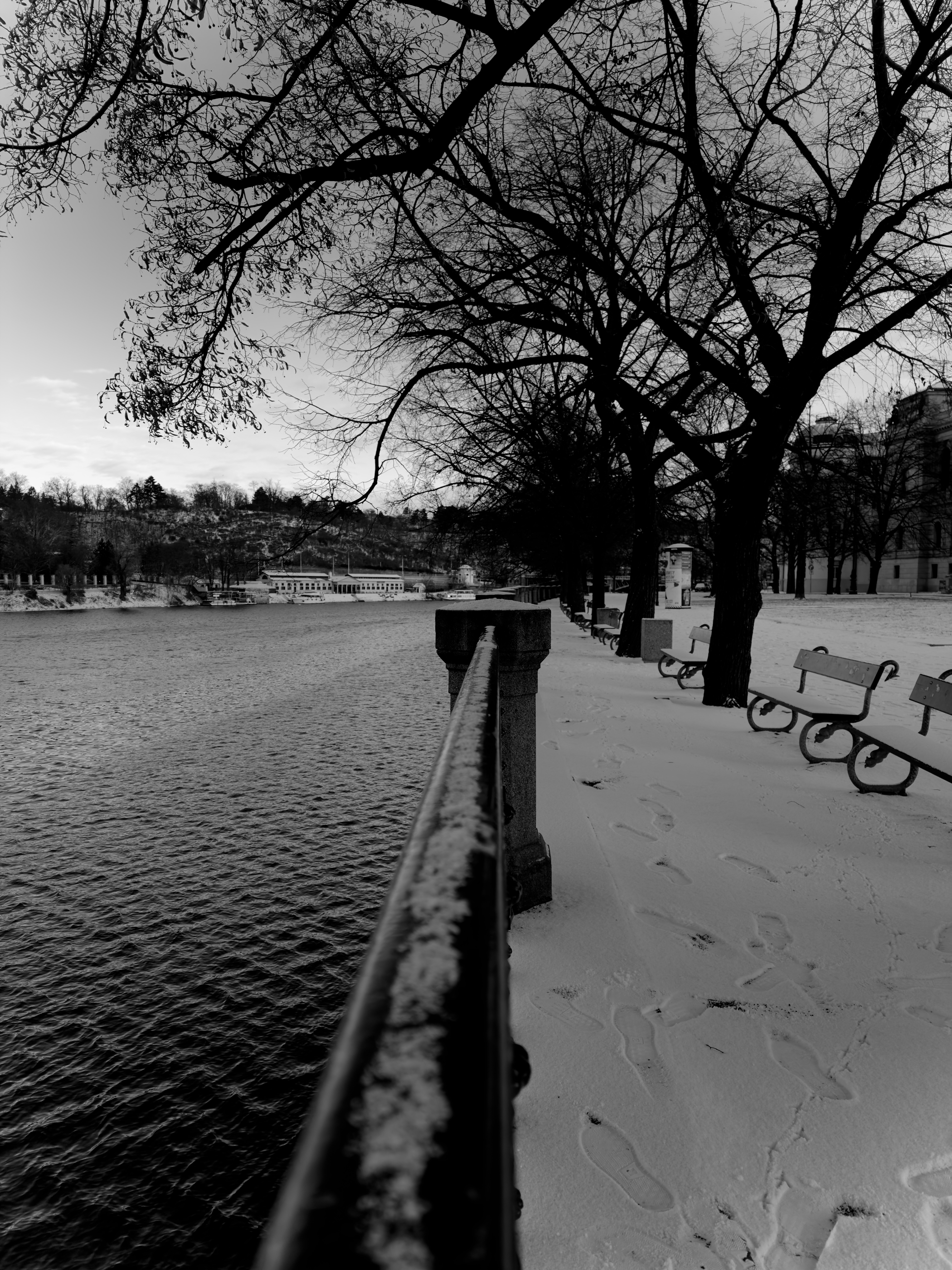 On Dvořák Embankment, the river becomes a long, calm mirror. Fog drifts above the surface in gentle waves, blurring the outlines of bridges and towers. Boats sit still in their moorings, and reflections stretch softly across the water. Here, winter feels expansive — a pause wide enough for breath.