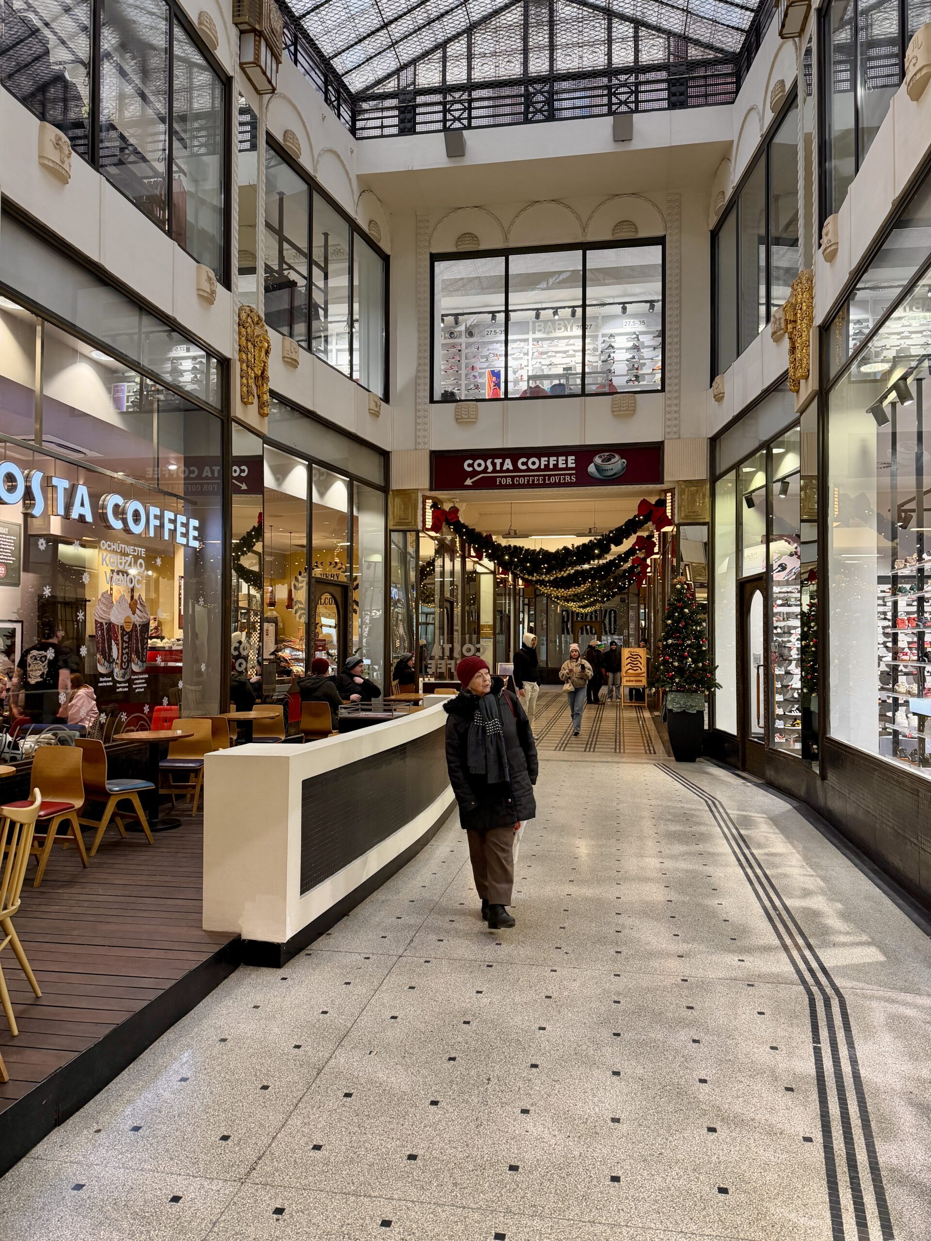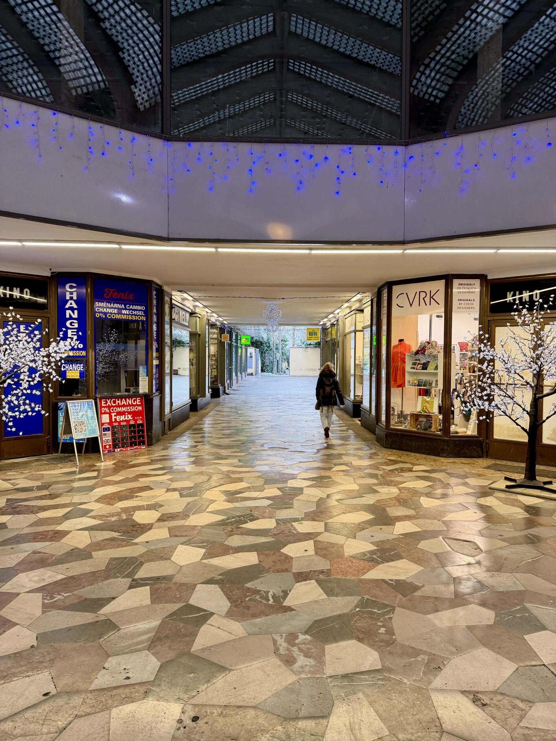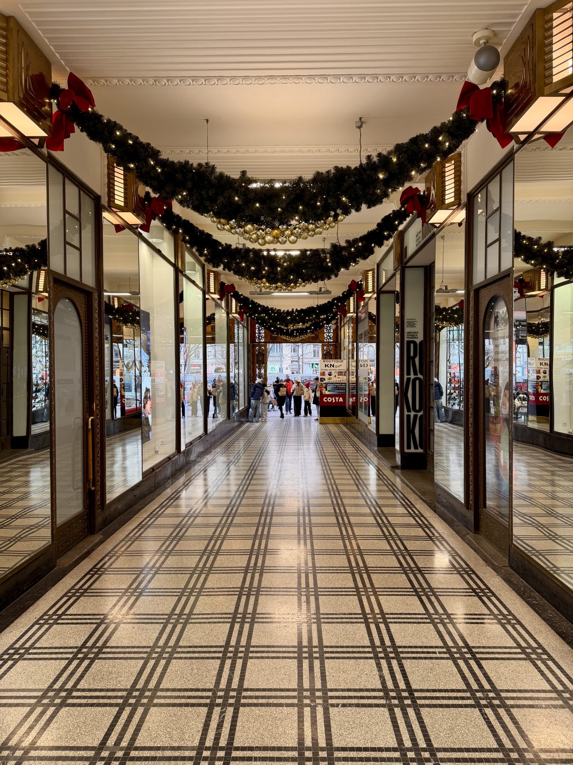 Lucerna is one of Prague’s cultural icons, but its winter charm lies in its atmosphere rather than its history. Warm light gathers beneath balconies and arches. Reflections soften along the floors. Architectural details appear theatrical without feeling staged.
