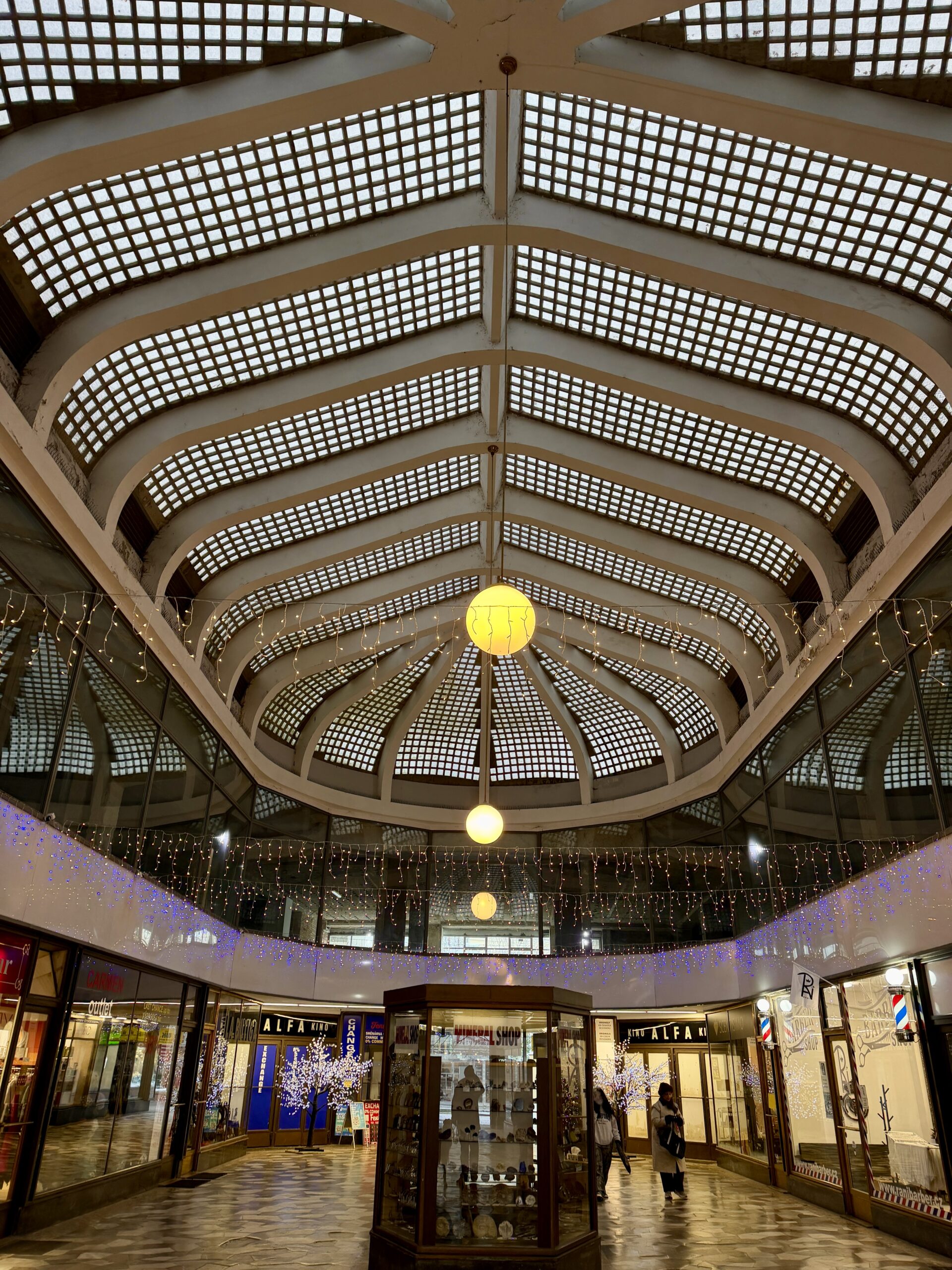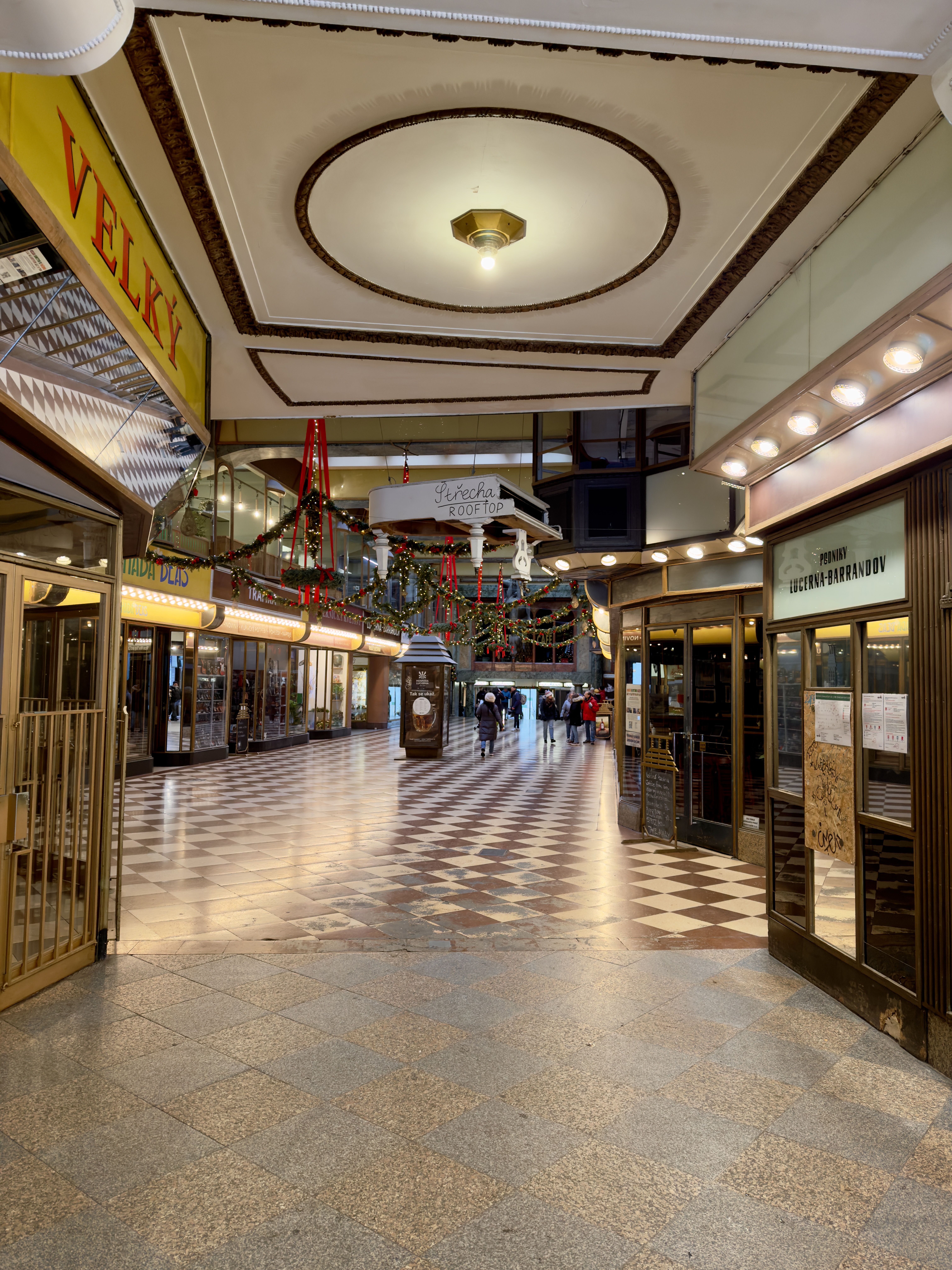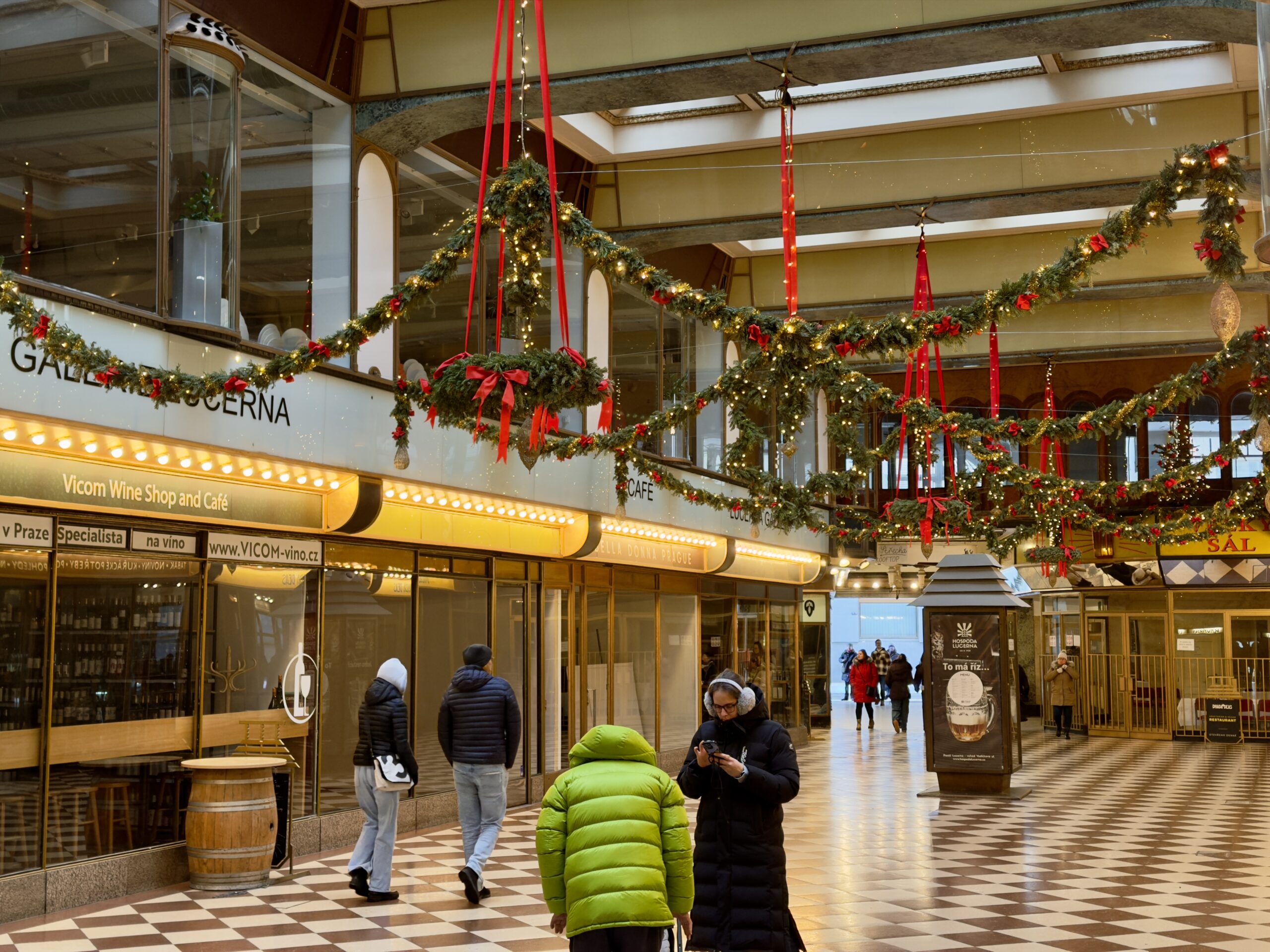 Lucerna is one of Prague’s cultural icons, but its winter charm lies in its atmosphere rather than its history. Warm light gathers beneath balconies and arches. Reflections soften along the floors. Architectural details appear theatrical without feeling staged.
