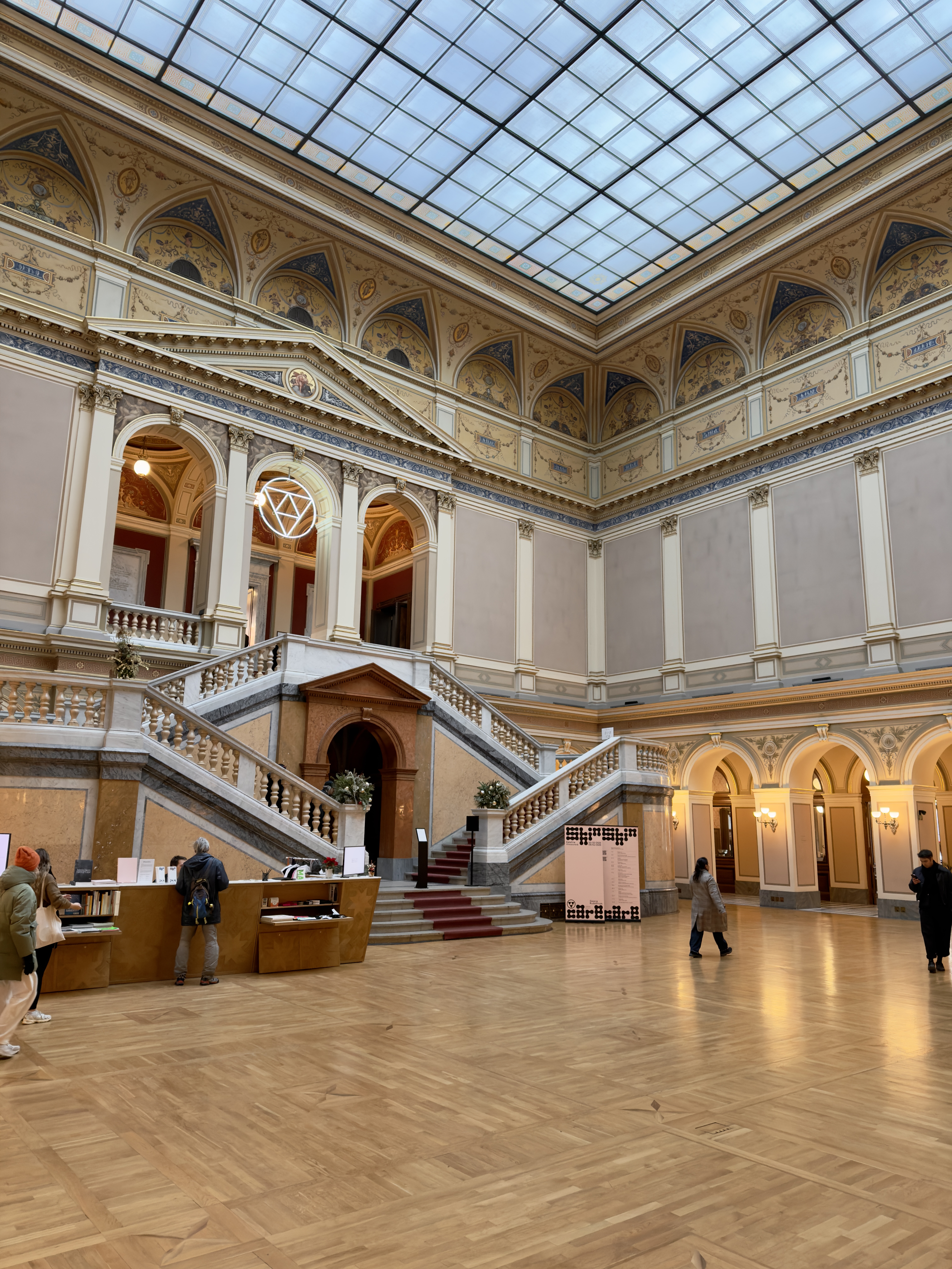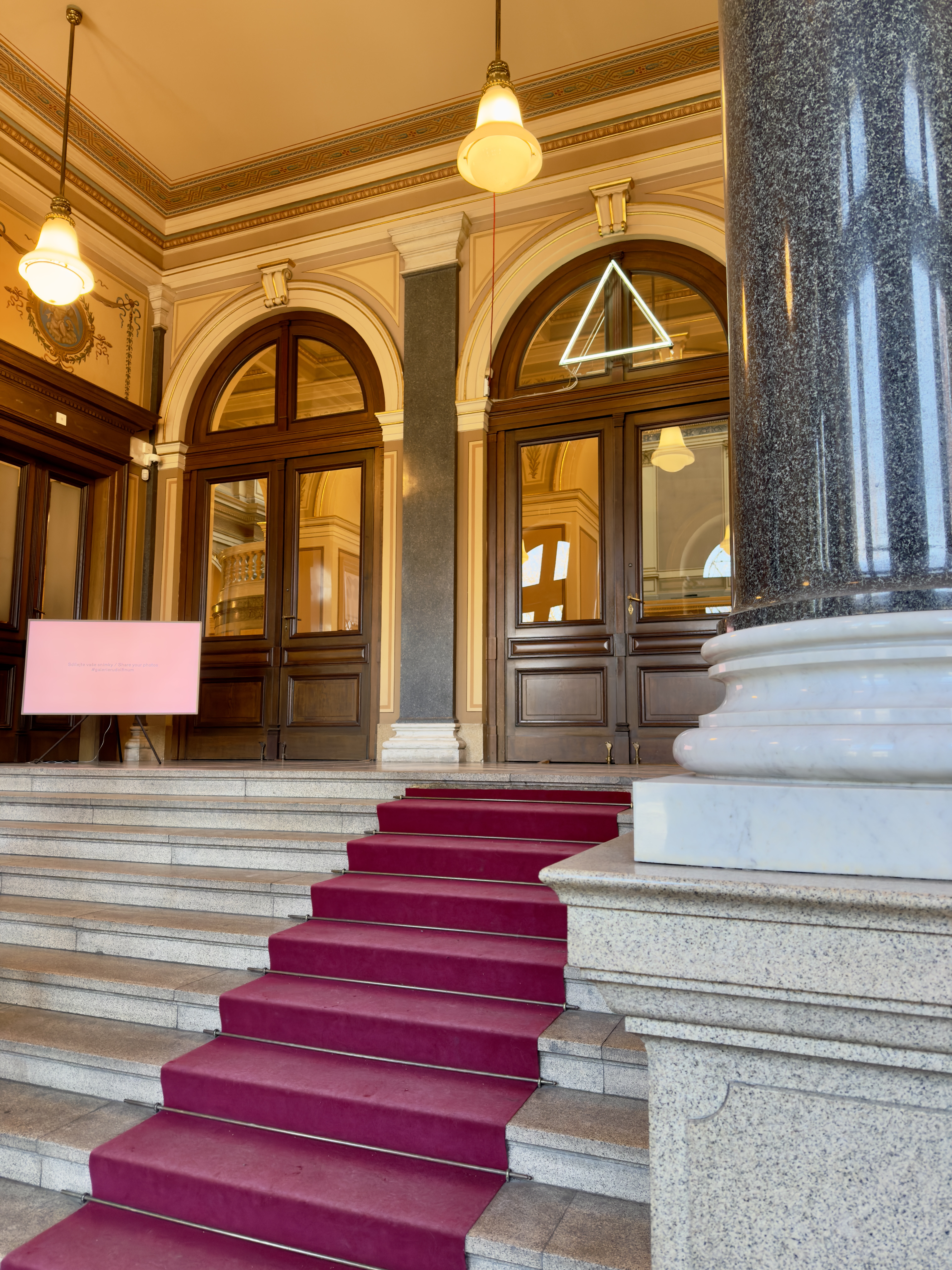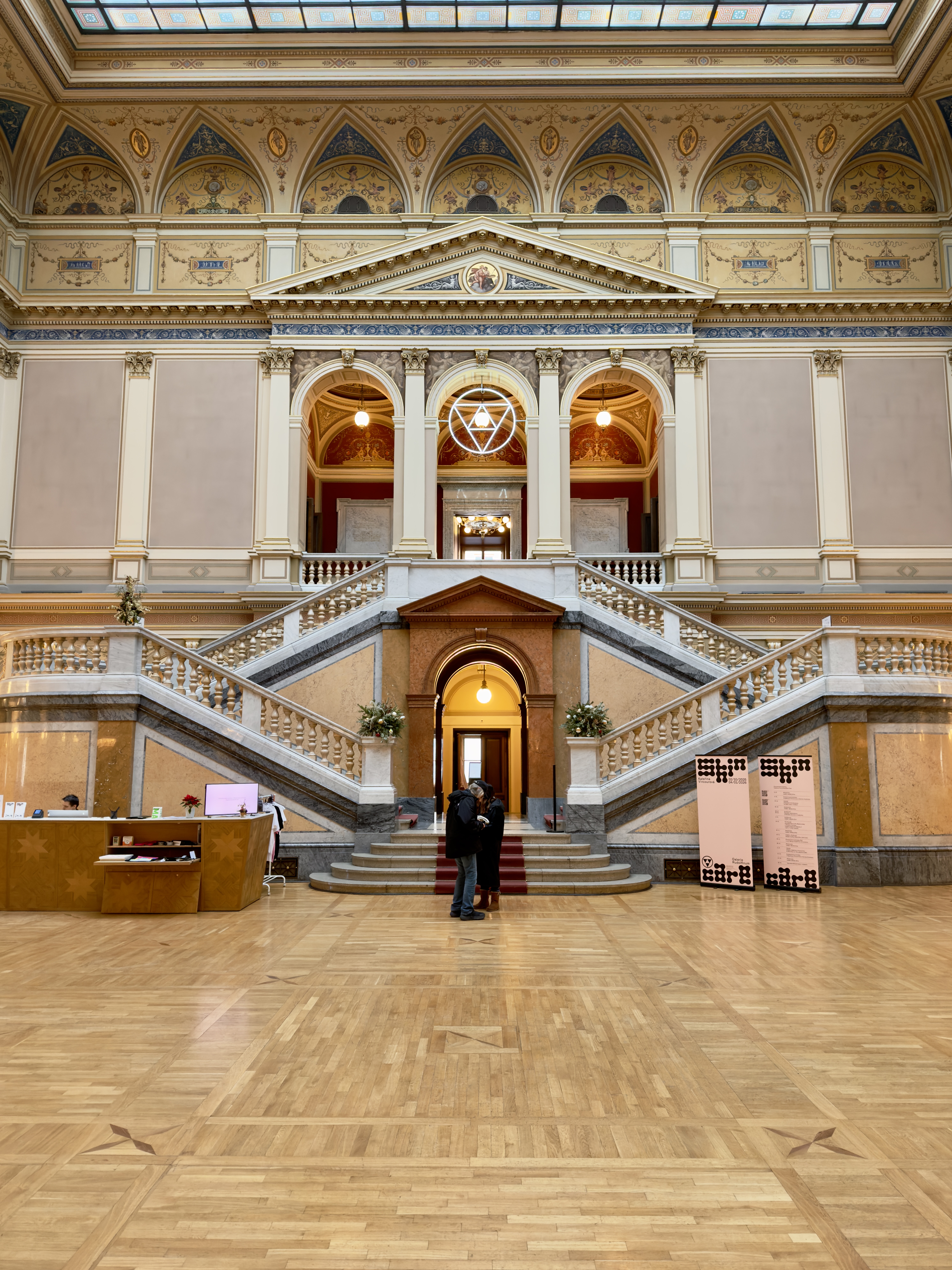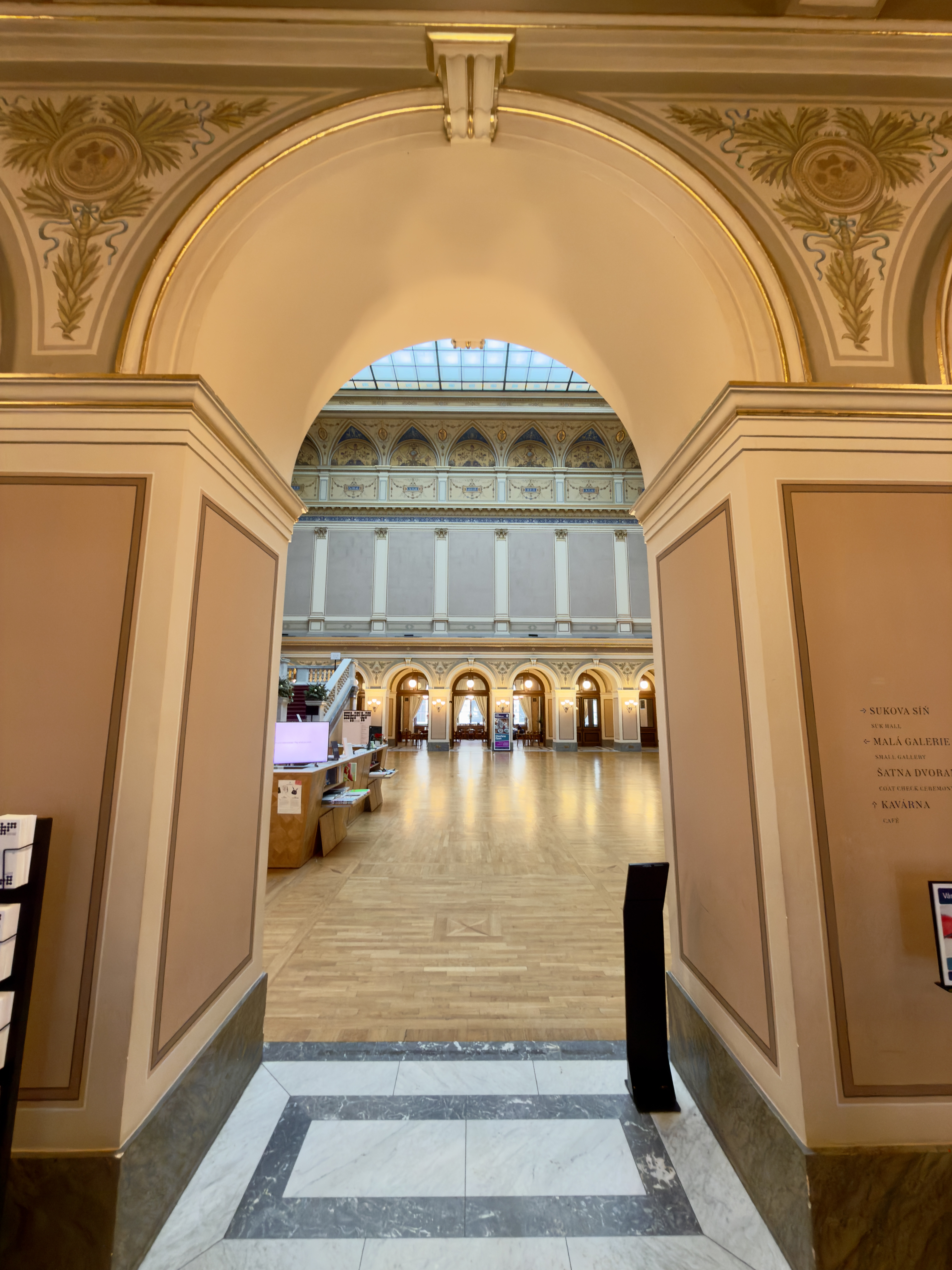 In winter, Rudolfinum feels especially calm. Its neoclassical façade stands in clear contrast against the pale sky, and the river beside it moves in a slow, steady rhythm. Stepping inside replaces the cold air with soft light and warm tones. Corridors unfold gently, and the building’s ornamental details — polished stone, delicate mouldings, subtle gold accents — appear more defined against the muted season.